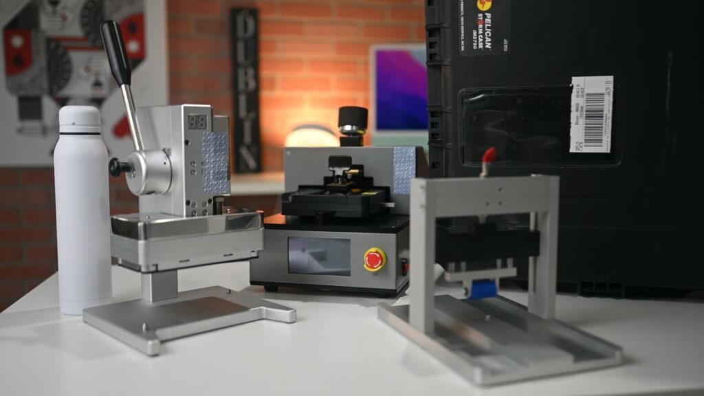 Jsou tam dvě malé krabice plné šroubováků, krytů displejů, přísavek a plastového spudgeru. Pak jsou tu dva velké kusy vybavení — zobrazovací lis a bateriový lis — a zásobník, který je drží.