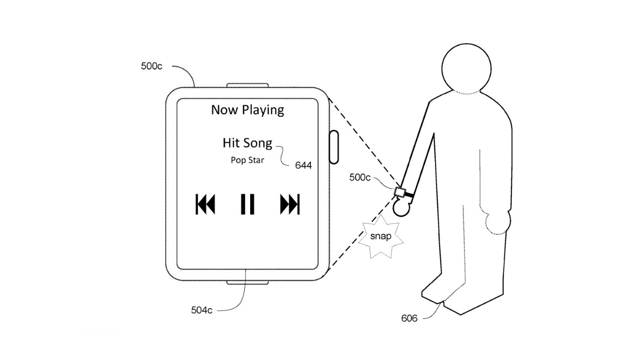 Detail z patentové přihlášky ukazující pohyb zápěstí Apple Watch ovládající hudbu Zní to jako vtip, ale v...
