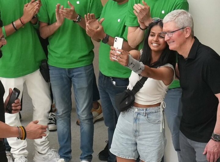 Tim Cook (uprostřed) a Deirdre O’Brien (vpravo) na otevření Apple Saket (Zdroj: Apple) Tim Cook a Deirdre...