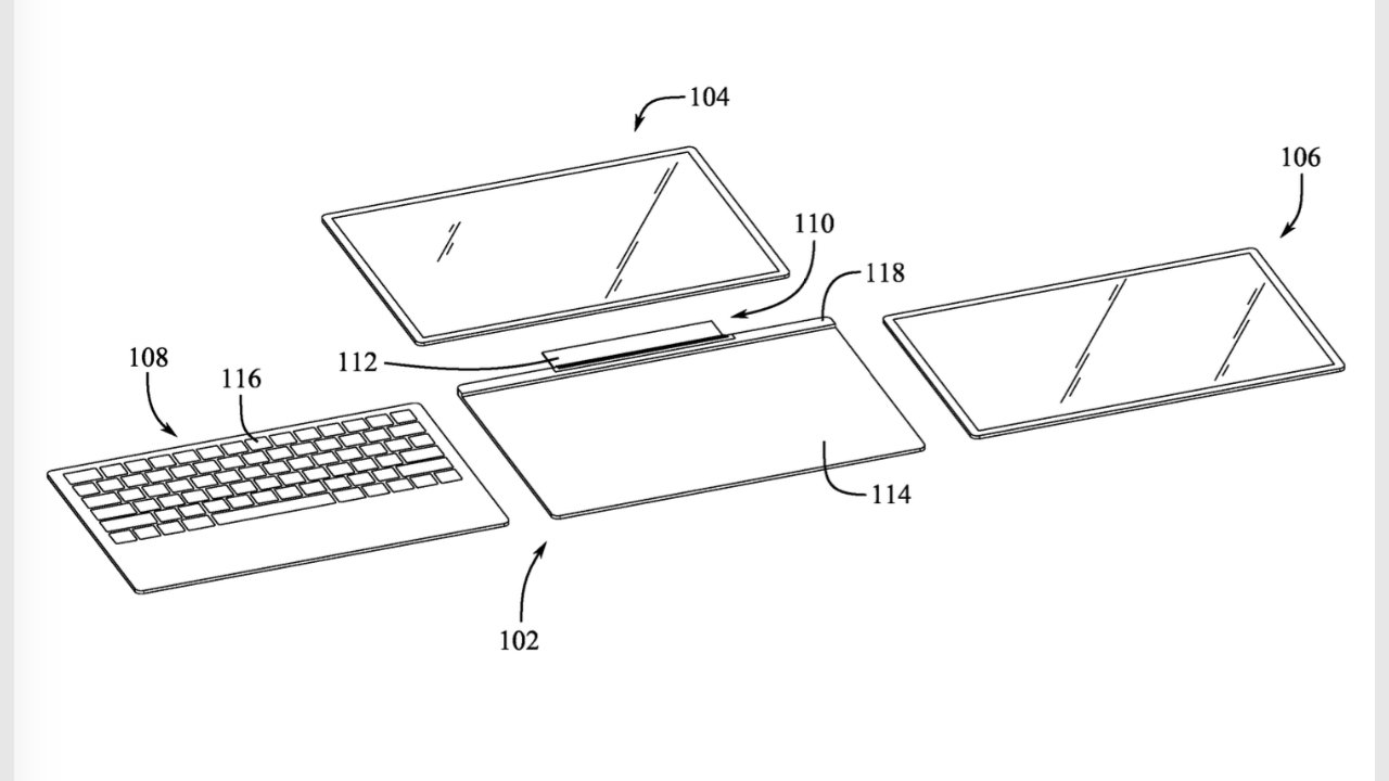 Patent pak nastiňuje, jak například notebooky „obecně předpokládají véčkovou konfiguraci“, zatímco tablet je dotyková obrazovka a stolní počítače „obecně obsahují samostatný displej, klávesnici a věž“.