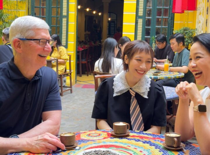 Tim Cook (vlevo) s hudebníky My Linh a My Anh v Hanoji Generální ředitel Applu Tim Cook...
