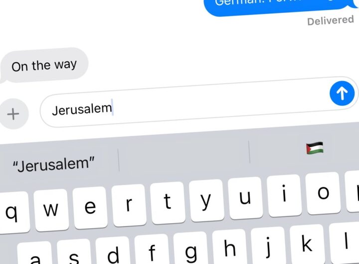 Příklad zobrazení palestinské vlajky jako návrh prediktivního textu pro Jeruzalém v iMessage Systém prediktivního textu společnosti Apple...
