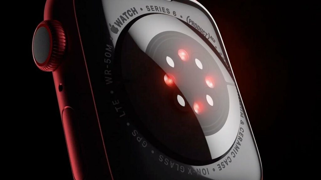 Senzor Apple Watch používaný ke sledování srdeční frekvence a provádění EKG