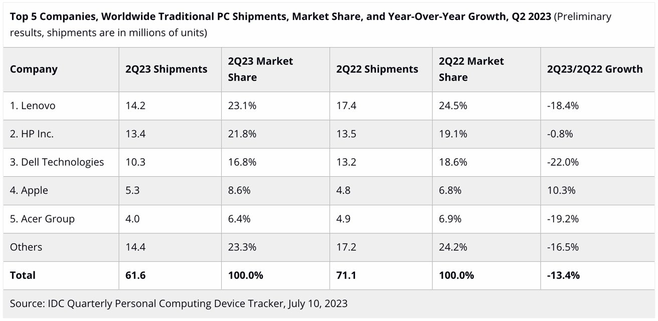 Podle zprávy společnosti IDC se odhady celosvětového prodeje osobních počítačů ve druhém čtvrtletí roku 2023 meziročně snížily o 13,4 %, což znamená, že jde o šesté čtvrtletí poklesu v řadě. Vina za pokles je zaměřena na „makroekonomické protivětry, slabou poptávku ze spotřebitelského i komerčního sektoru a posun v rozpočtech na IT od nákupů zařízení,“ píší analytici.