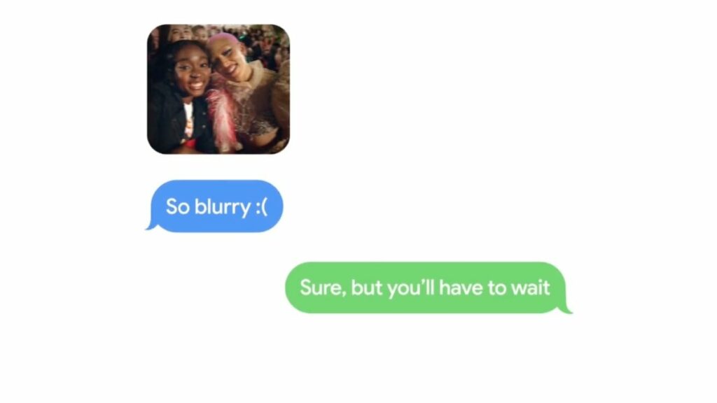 Google škádlí oznámení reklamou, která zobrazuje uživatele iPhonu, který žádá uživatele Androidu, aby opravil svou rozmazanou fotku.