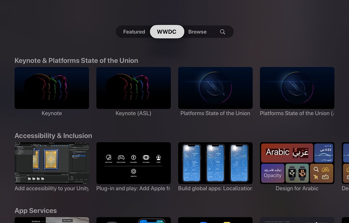 kliknutím WWDC zobrazuje mřížku miniatur pro videa z loňského WWDC – ale až letošní konference začne 5. června, bude starý obsah nahrazen letošními relacemi a obsahem.