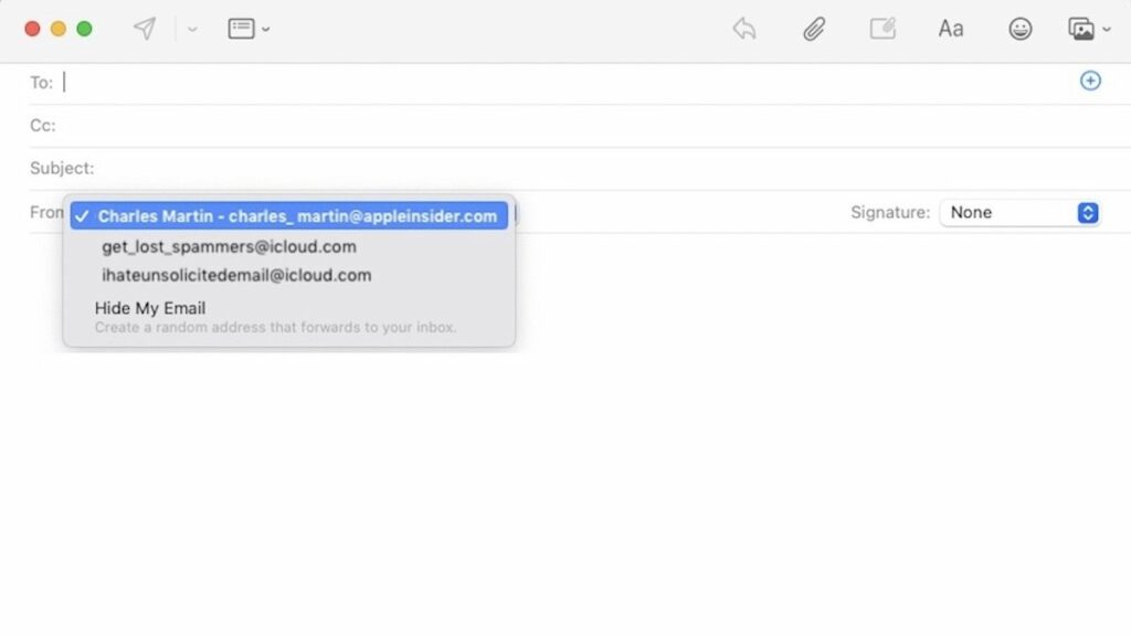 S aliasy nebo Skrýt mé adresy je způsob jejich použití v odchozím e-mailu stejný: klikněte na výchozí adresu „od“ a vyberte si z vyskakovacího seznamu zvolených aliasů nebo dříve používaných Skrýt moji e-mailovou adresu (nebo vyberte „Skrýt můj e-mail“ pro vygenerování nového). Odpovědi se buď přeposílají na vaši „skutečnou“ e-mailovou adresu iCloud.