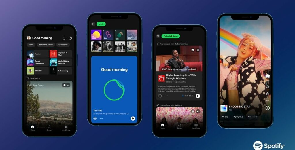 Nový domovský kanál, který má podobný styl jako TikTok a příliš se neliší od Apple Music Connect, umožňuje uživatelům procházet náhledy videa a zvuku pro hudbu, podcasty a audioknihy a obsahuje nové kanály videa, které lze objevit v sekci Hledat. Spotify také zdůraznilo DJ, Smart Shuffle a automatické přehrávání podcastů.
