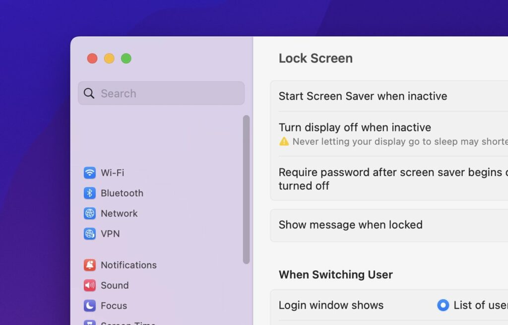 Z bezpečnostních důvodů vám macOS umožňuje uzamknout obrazovku vašeho Macu, aby ostatní nemohli získat přístup k vašemu Macu, když od něj nejste. Tyto možnosti umožňují nastavit heslo potřebné k odemknutí obrazovky po jejím uzamčení, vypnutí obrazovky, spuštění spořiče obrazovky a nastavení možností pro Rychlé přepínání uživatelů.