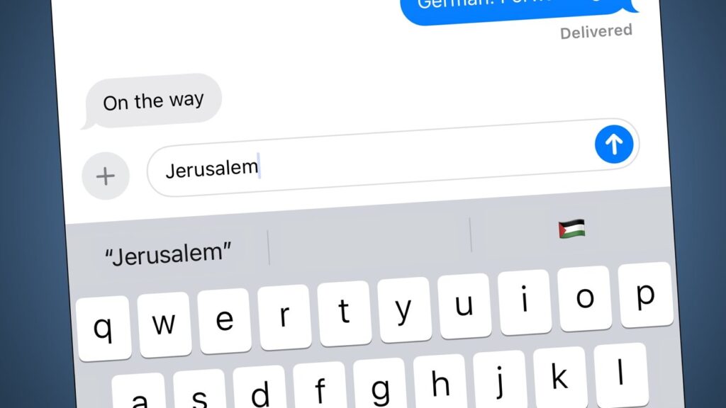 Příklad zobrazení palestinské vlajky jako návrh prediktivního textu pro Jeruzalém v iMessage