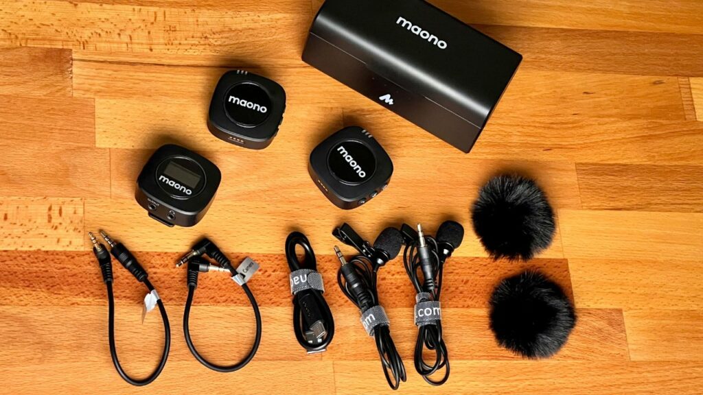 Přestože se jedná o levný bezdrátový mikrofonní systém, Maono nešetří na tom, co vám dají. Získáte dva vysílače, jeden přijímač, nabíjecí pouzdro, nabíjecí kabel USB-C, dva klopové mikrofony, dva audio kabely, dvě kožešinová přední skla a tašku na přenášení všeho kolem.