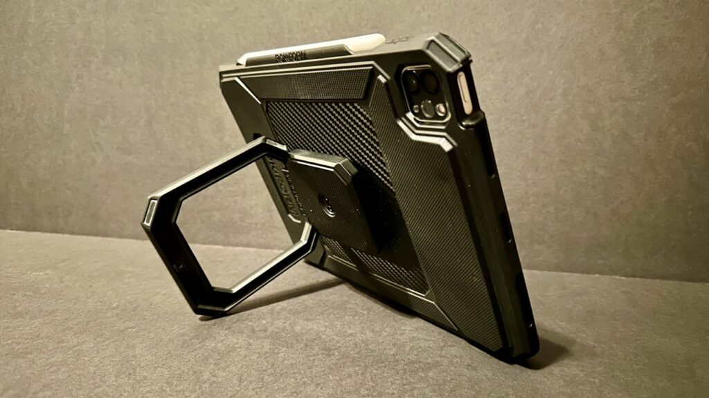 Pouzdro Rugged iPad Case nabízí odolný design, který nabízí konektivitu k magnetickým povrchům a možnost přidat další příslušenství na zadní stranu pomocí metody instalace push-and-twist.