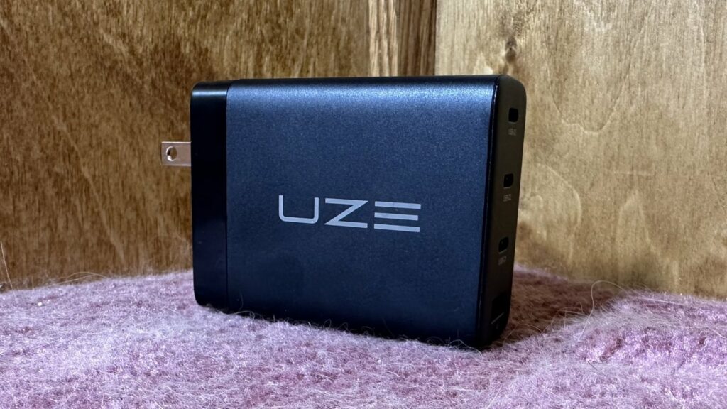 Nabíječka Uze 100W GaN Charger je navržena jako téměř každá jiná nabíjecí kostka, na boku má název společnosti, vpředu jsou výstupky a na zadní straně jsou nabíjecí porty.