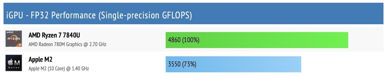 Zaměříme-li se výhradně na GPU část těchto dvou čipů, podívali jsme se na kompilované výsledky pomocí testu iGPU, který měří, kolik miliard 32bitových operací s pohyblivou řádovou čárkou může každý provést za sekundu. GPU M2 je polovina rychlost GPU 7840u, a přesto ztratil pouze 27 procent.