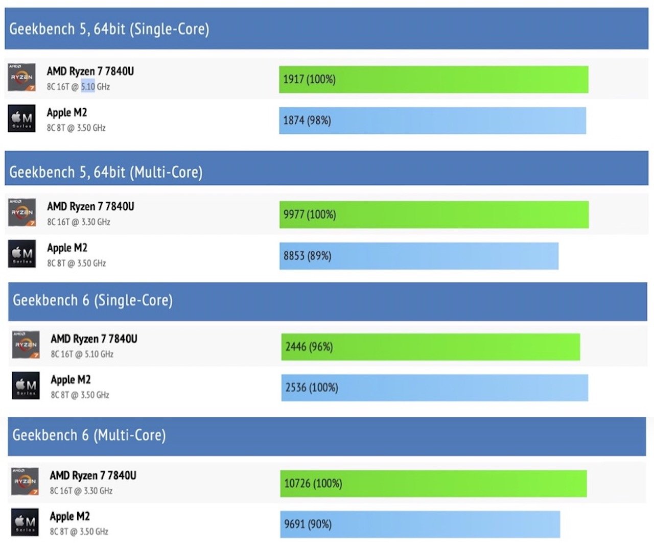 Čipy byly také testovány na dvou různých verzích Geekbench, v5 a v6. V testech Geekbench 5 byly 7840u a M2 téměř identické v jednojádrovém skóre a mnohem těsněji se shodovaly ve vícejádrovém, ačkoli 7840u byl stále rychlejší – tentokrát však pouze o 10 procent.