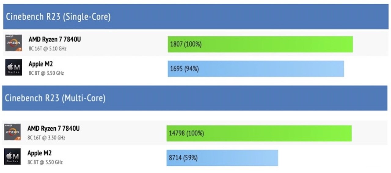 Vícejádrové skóre Cinebench ukazuje, kde 7840u vyniká, vzhledem k tomu, že má dvojnásobný počet vláken, která mohou běžet paralelně ve srovnání s M2, nazývaným hyperthreading. Čip AMD dosáhl skóre 14 798, což je o 40 procent rychleji než skóre M2 8714.